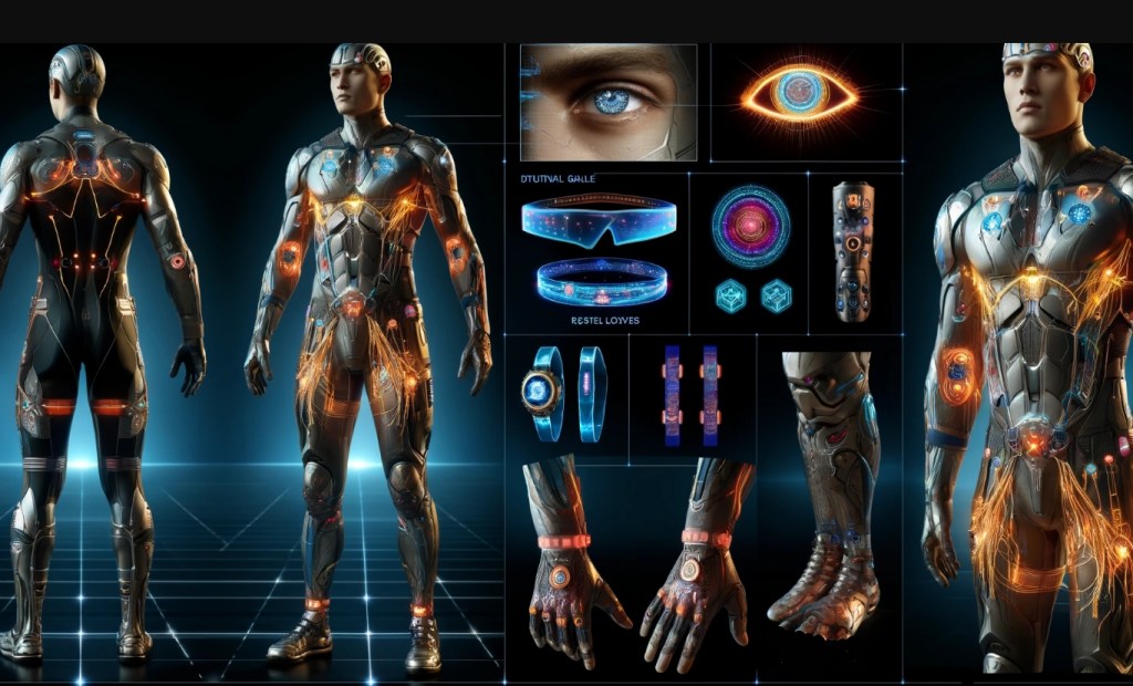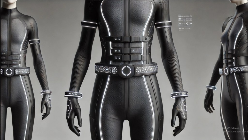 - Traje biodigital con microfibras láser y sensores biométricos.