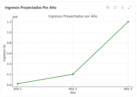 - Año 3: Producción máxima de 100 millones, con ingresos proyectados de $1,200 millones.