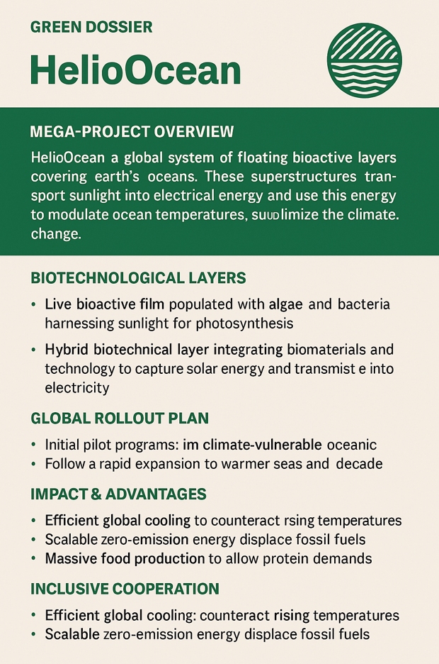 HelioOcean is an integrated, scalable solution that combines marine biotechnology, solar energy, liquid photonics, and intelligent biofilms to form a new infrastructure for energy generation, climate control, and food production over the ocean’s surface. It is conceived as a natural and safe alternative to high-risk geoengineering proposals such as Scopex, offering immediate and measurable results in global temperature reduction, renewable energy production, and protein biomass generation.