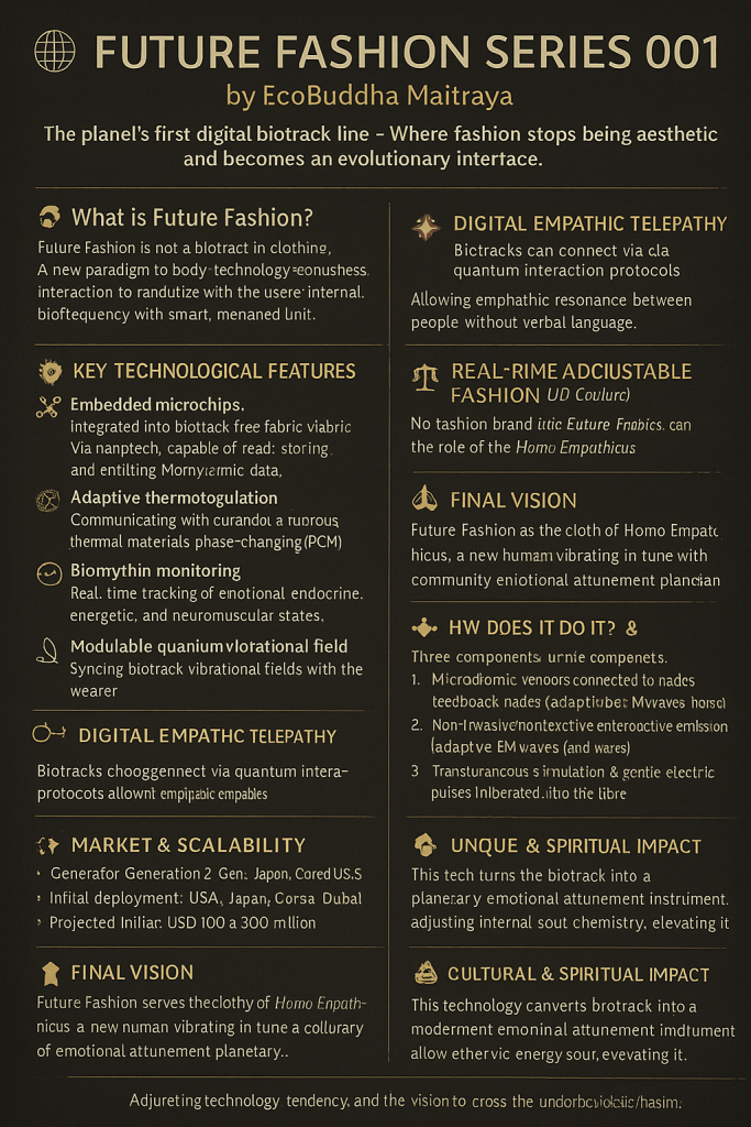 Future Fashion Series 001 marks the birth of a new species of clothing: digital biowearables designed to adapt to the user in real time, synchronize with their internal biofrequencies, and evolve fashion from an aesthetic expression into an interactive neuro-emotional interface. This system represents the convergence of couture, bioengineering, AI, and quantum emotional modulation.