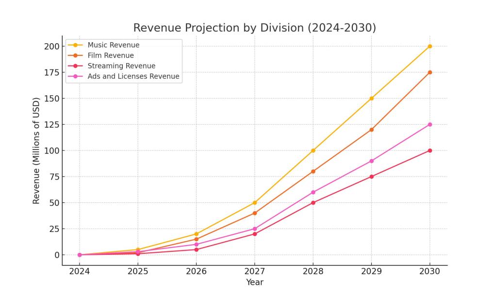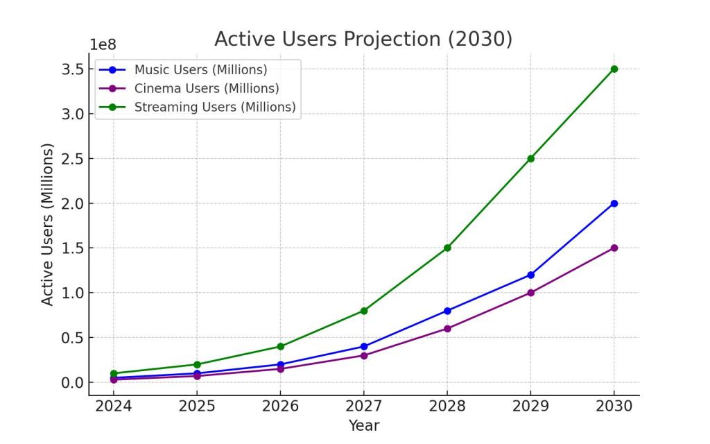 📊 Revenue: Estimated annual income of $520 billion by 2030 from music, film, and generative tools.