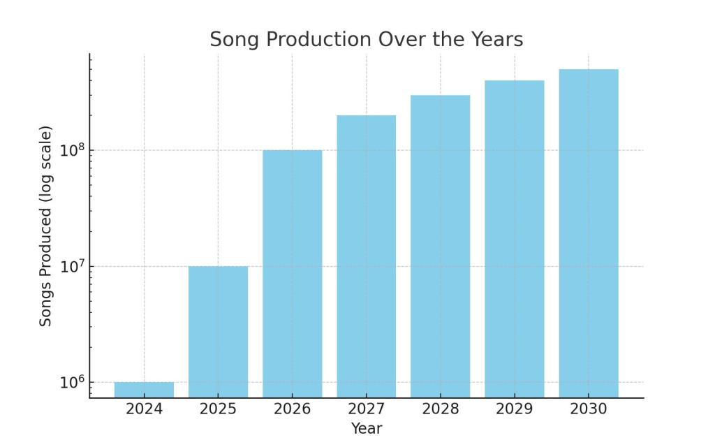 - 12 million songs per year by 2027, produced using AI generative technology for automated lyrics, arrangements, and vocals.